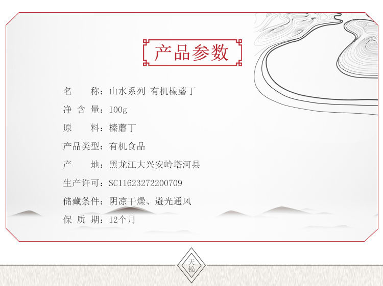 产品规格:天锦山水系列有机榛蘑丁100g*2盒