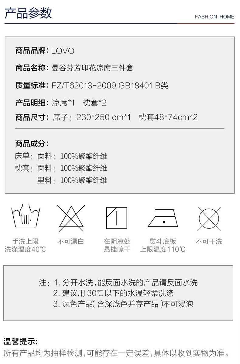 商品名称:LOVO/乐蜗家纺曼谷芬芳印花凉席三件套230*250cm