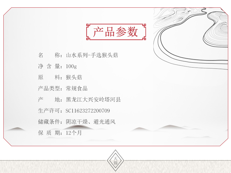 商品名称:天锦山水系列手选猴头菇100g*2盒