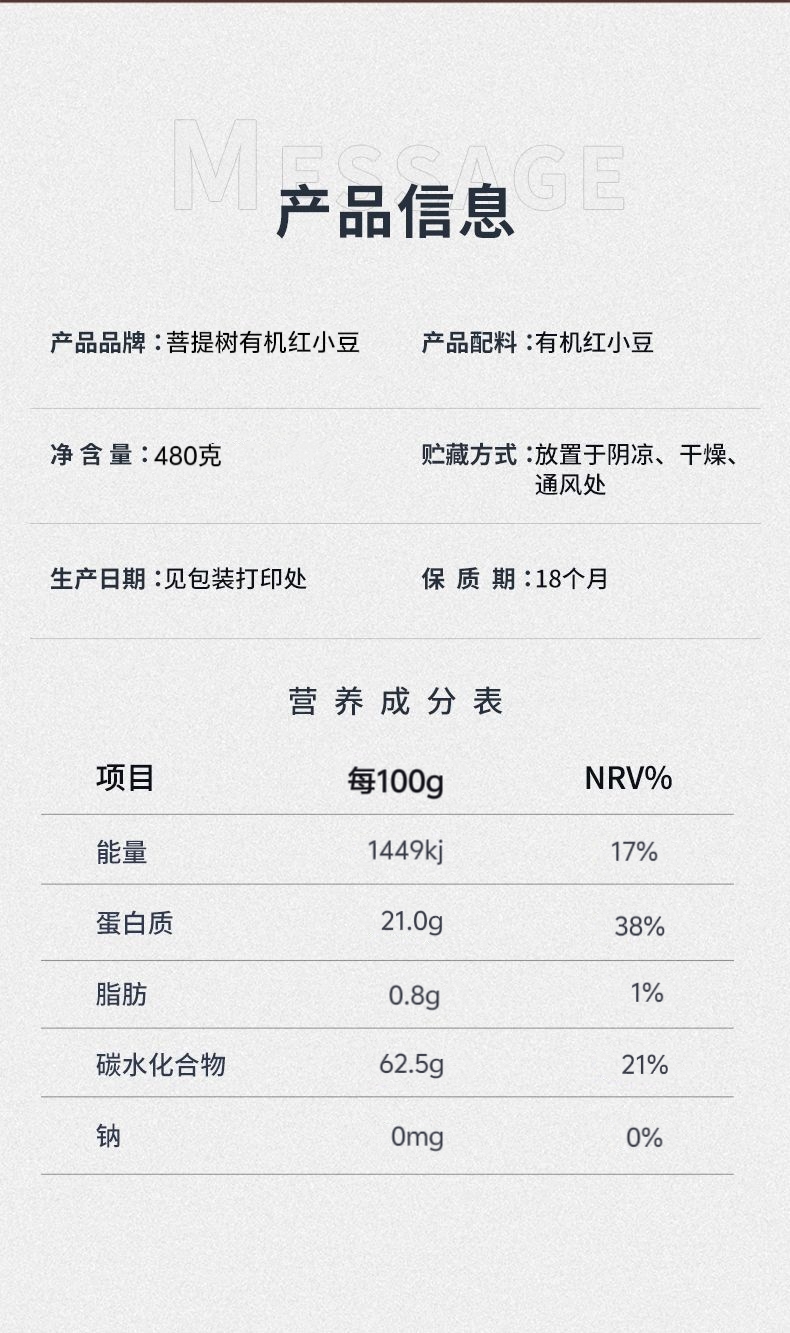 产品规格:菩提树有机红小豆480g*2袋