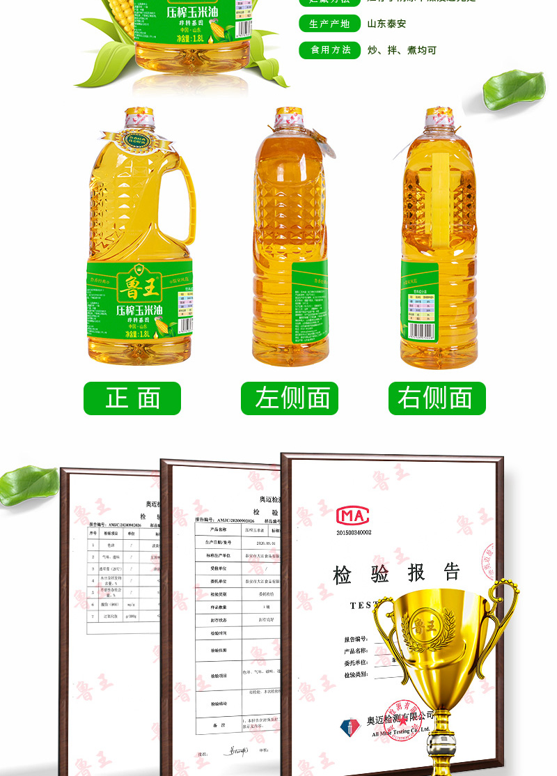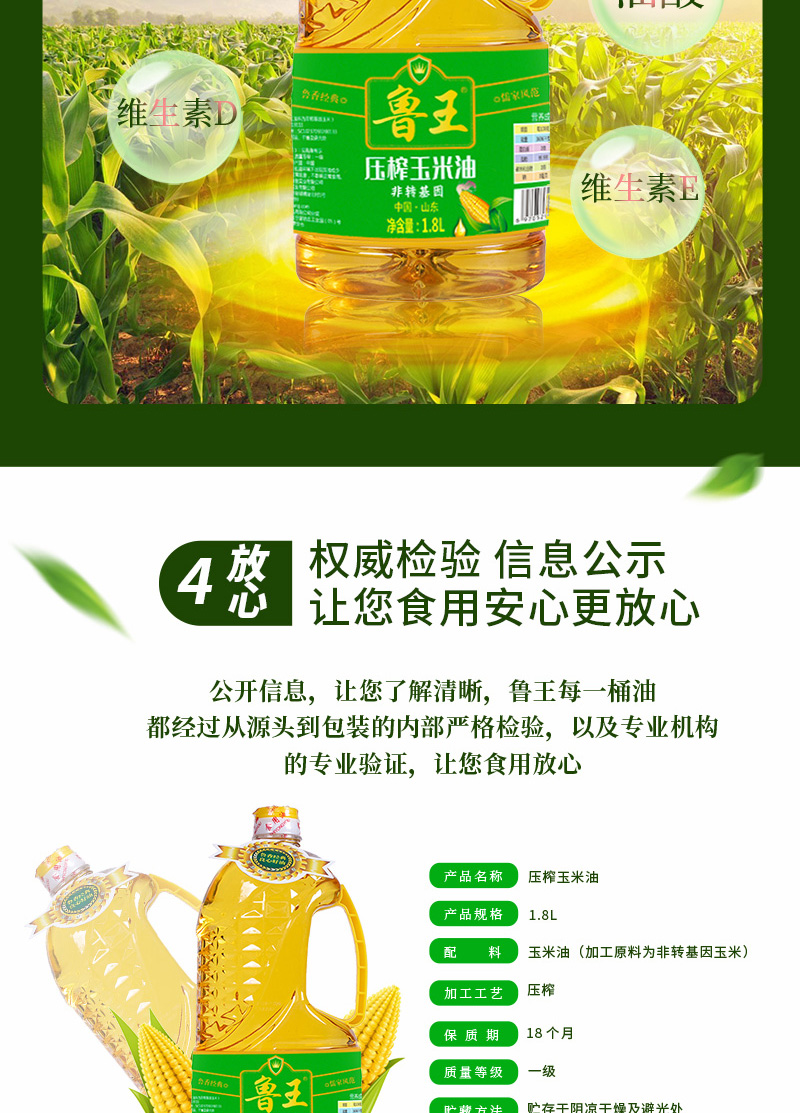 商品名称:鲁王绿色健康非转基因压榨玉米油1.8L