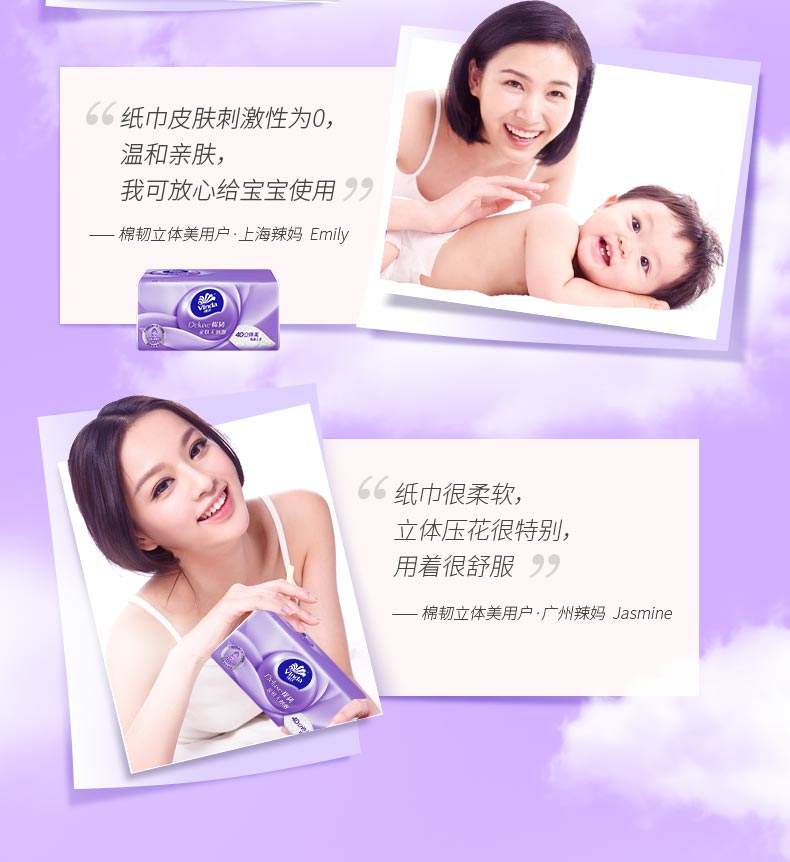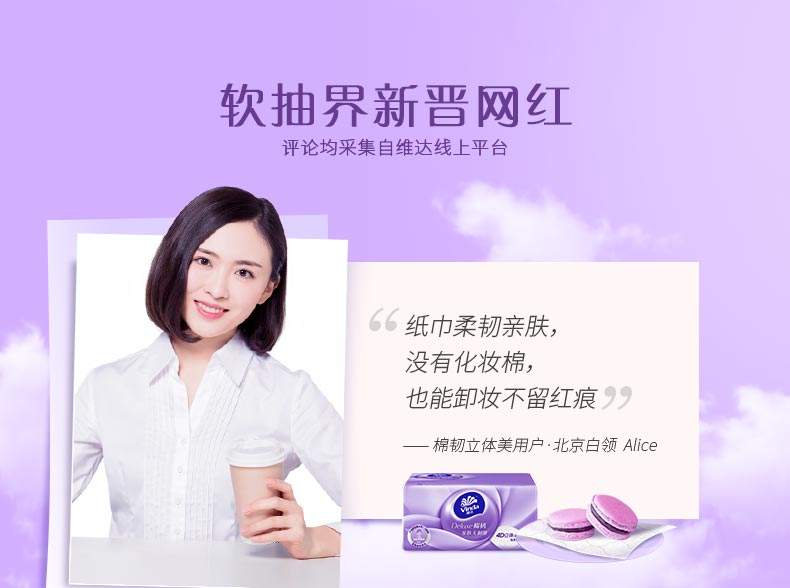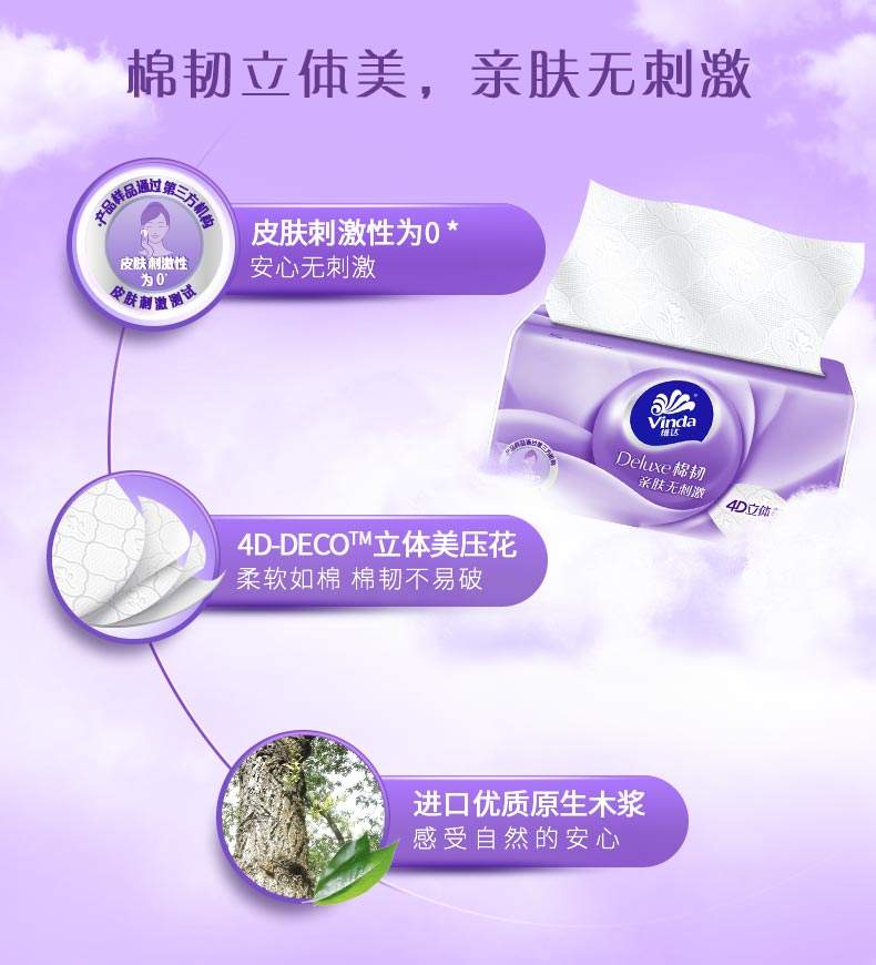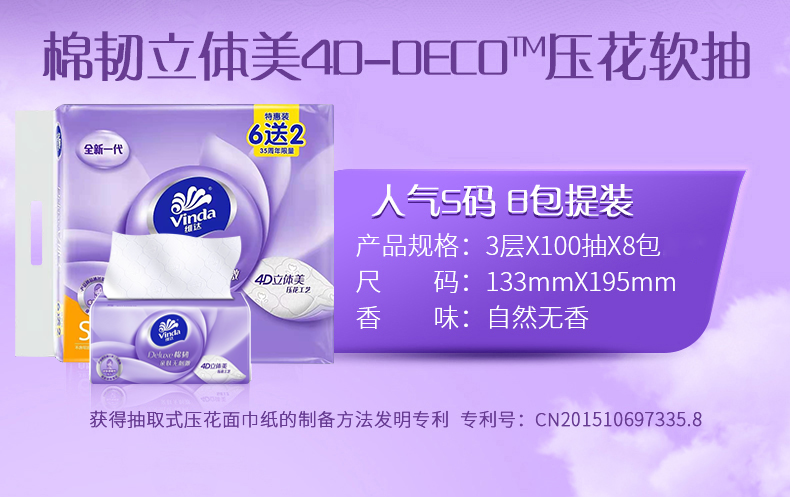 商品名称:Vinda/维达棉韧立体美三层压花软抽100抽8包*2提
