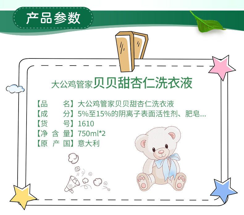 商品名称:CHANTECLAIR/大公鸡管家贝贝甜杏仁洗衣液750ml*2瓶