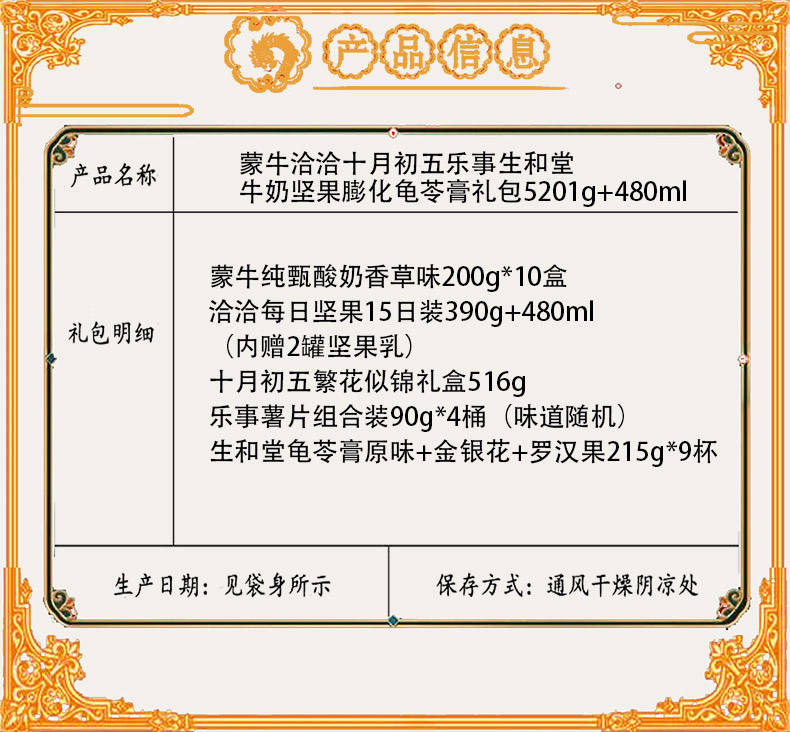 商品名称:【京东配送】蒙牛洽洽十月初五乐事生和堂牛奶坚果膨化龟苓膏礼包5201g+480ml