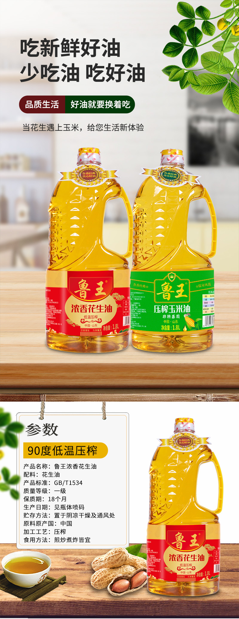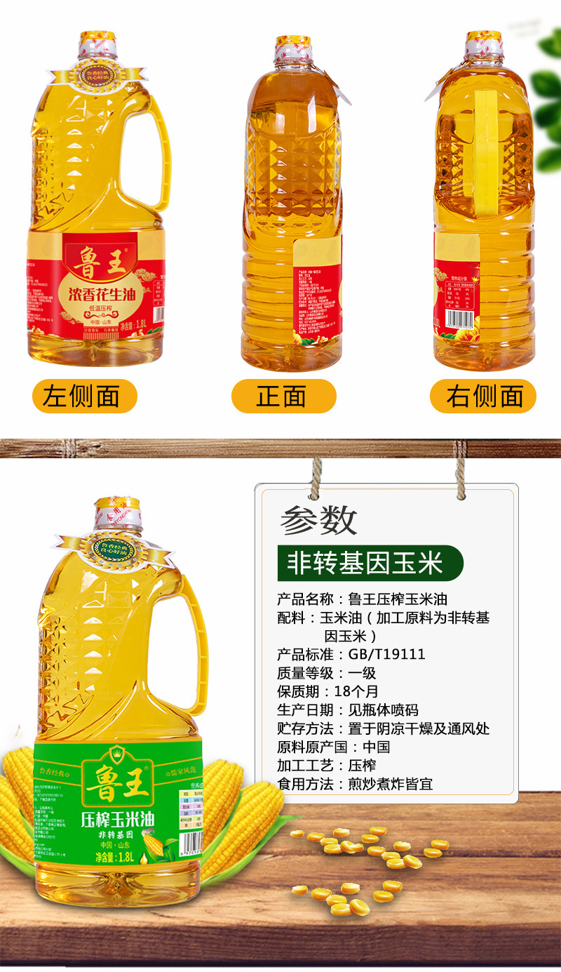 商品名称:鲁王浓香花生油1.8L+非转基因玉米油1.8L组合