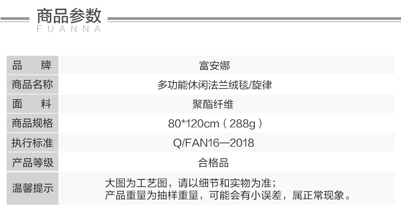 商品名称:FUANNA/富安娜旋律多功能休闲法兰绒毯80*120cm 288g