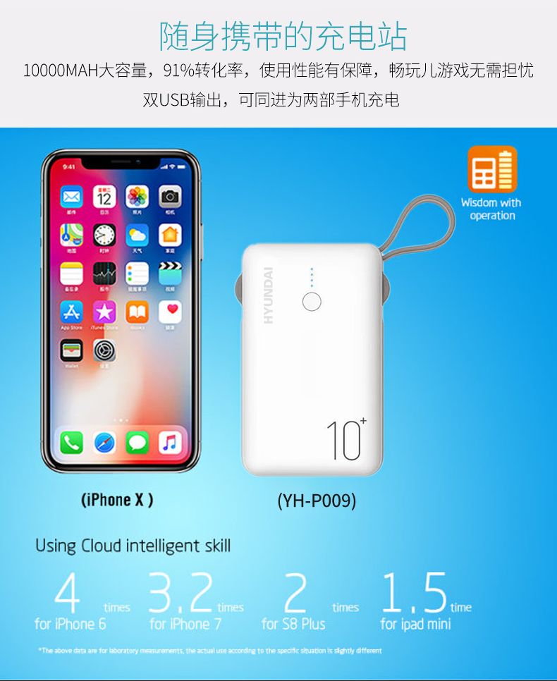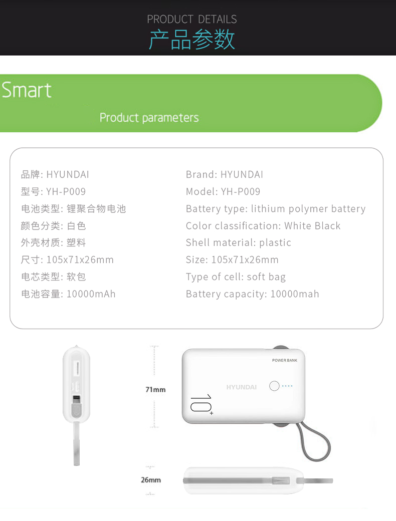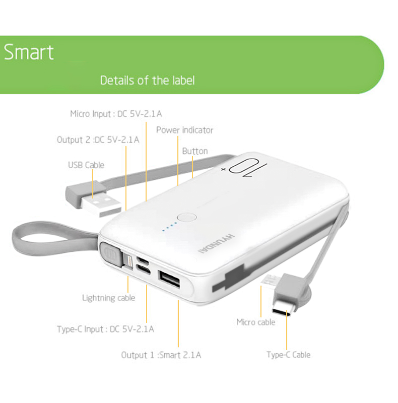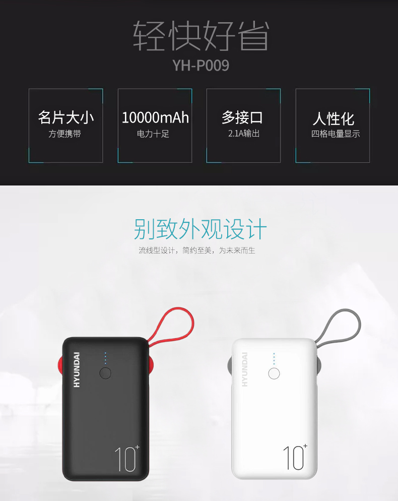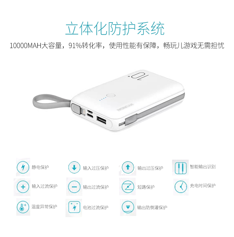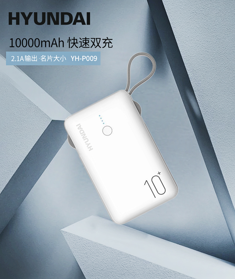 商品名称:HYUNDAI/现代10000mAh数据线移动电源 YH-P009 白色