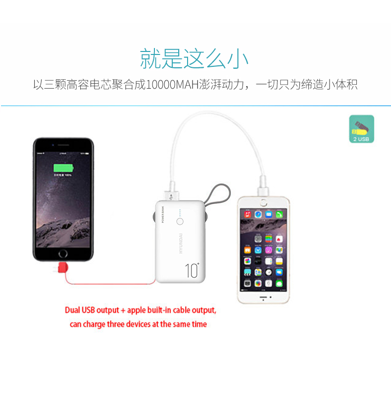 HYUNDAI/现代10000mAh数据线移动电源 YH-P009 白色