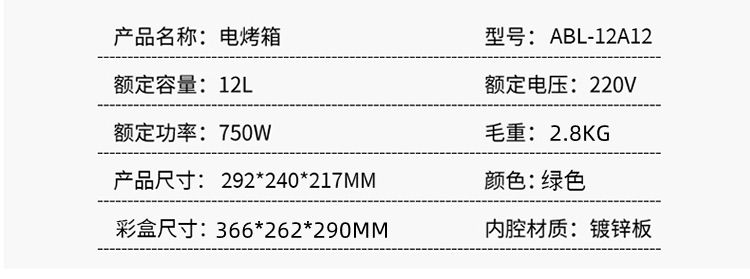 商品名称:ABEREVE/艾贝丽12升电烤箱-绿色ABL-12A12