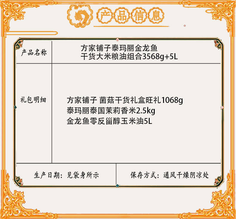 商品名称:【京东配送】方家铺子泰玛丽金龙鱼干货大米粮油组合3568g+5L
