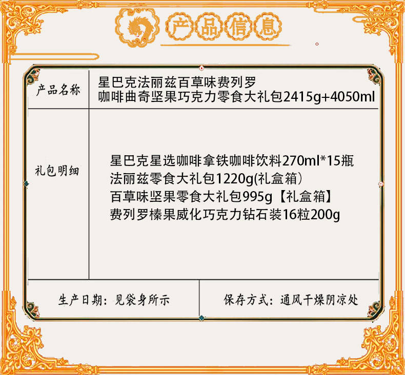 商品名称:【京东配送】星巴克法丽兹百草味费列罗咖啡曲奇坚果巧克力零食大礼包2415g+4050ml