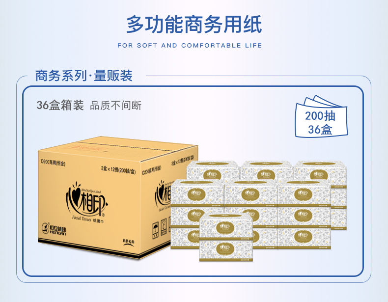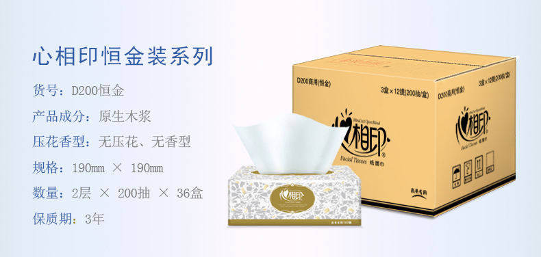 商品名称:心相印恒金装系列抽纸整箱2层200抽*36盒