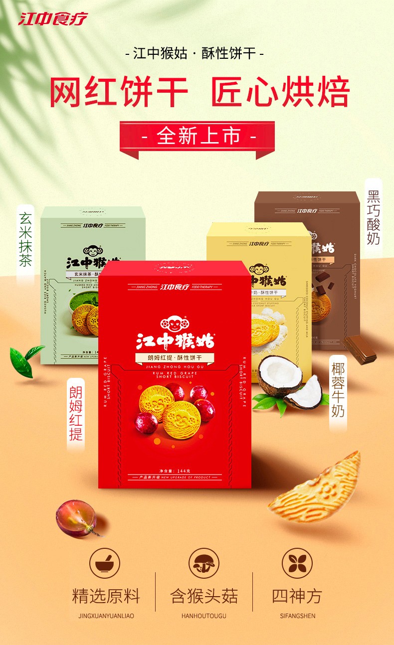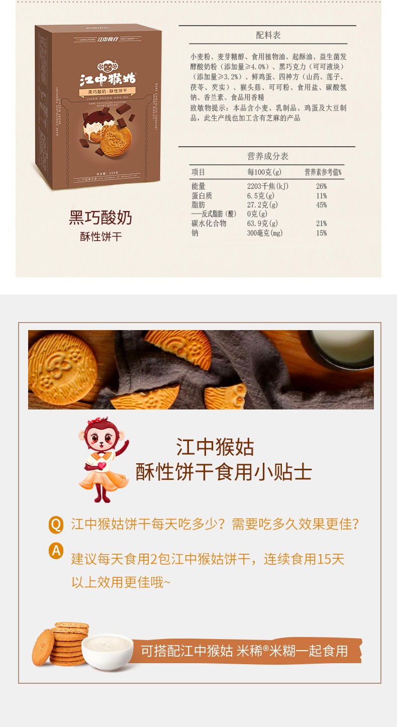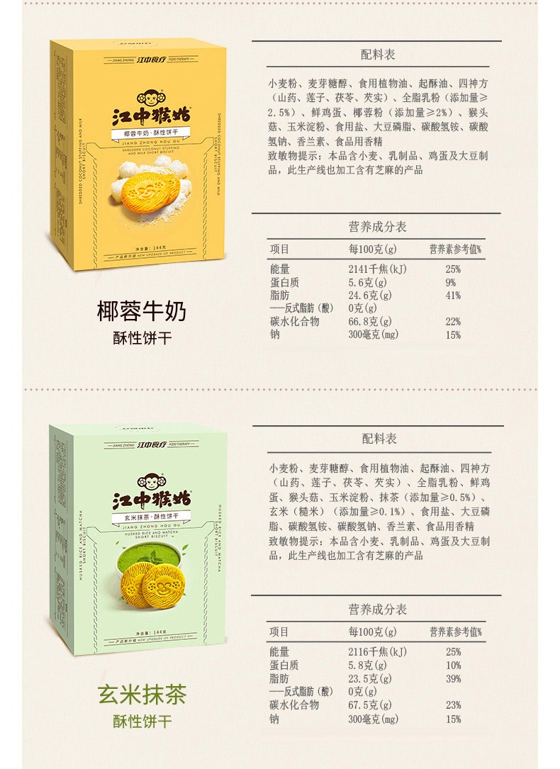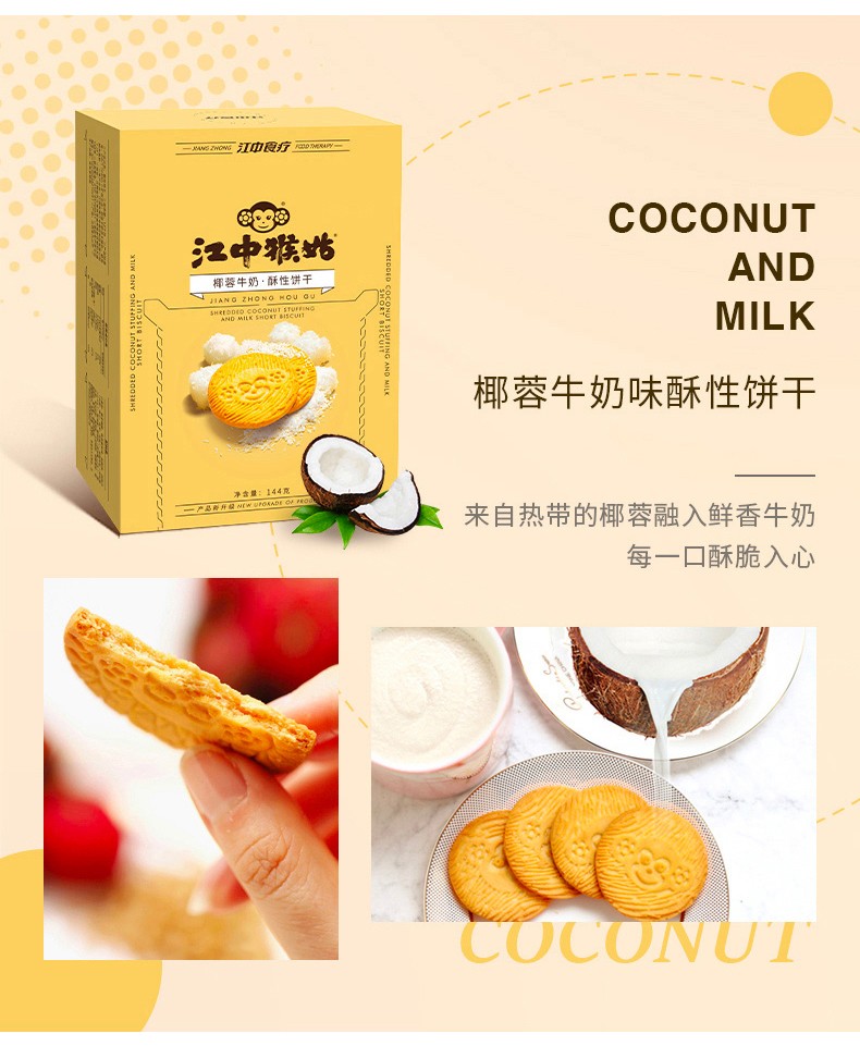 商品名称:江中猴姑四神方酥性饼干-椰蓉牛奶味144g*2盒