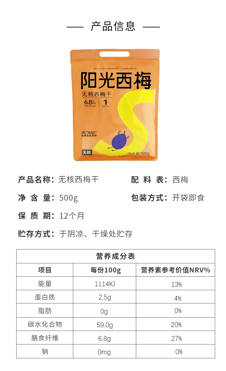 商品名称:阳光西梅无核大西梅干500g低脂无糖精无添加孕妇果脯蜜饯休闲零食