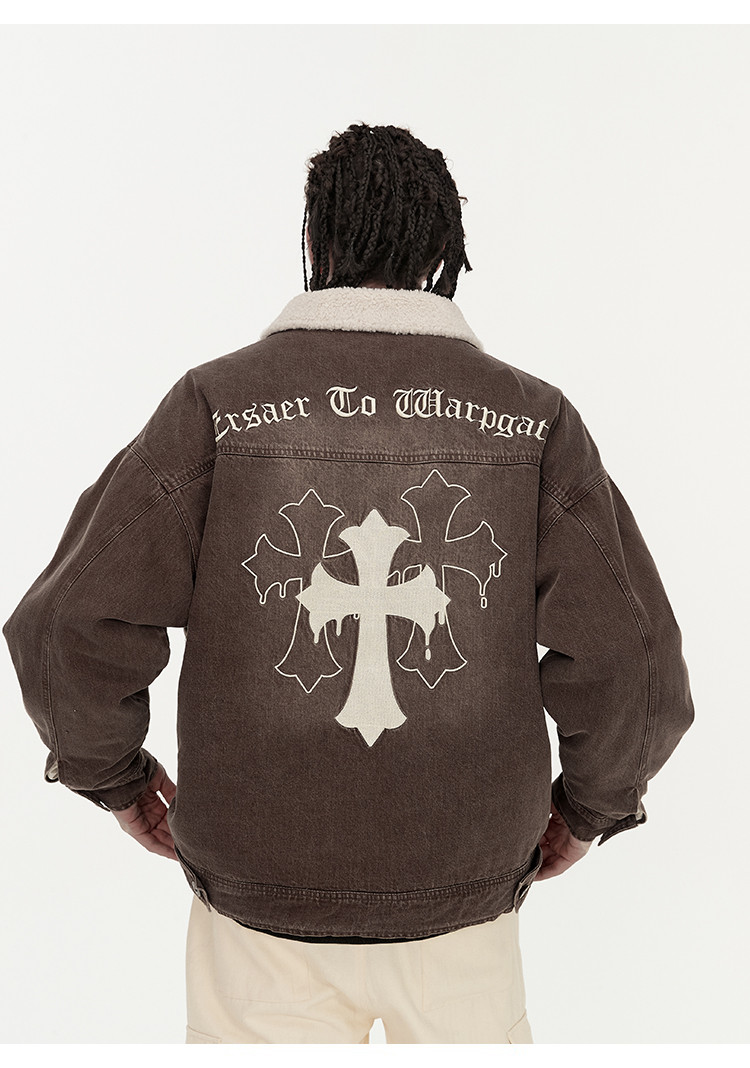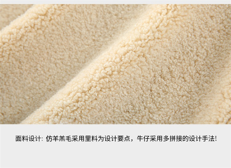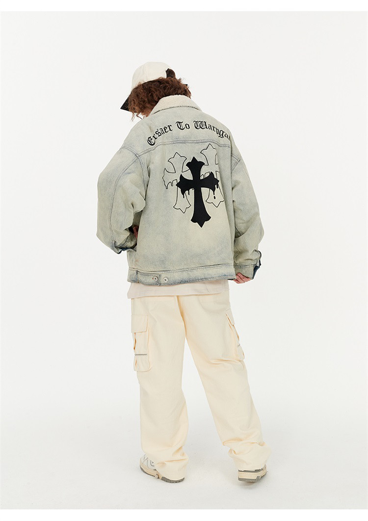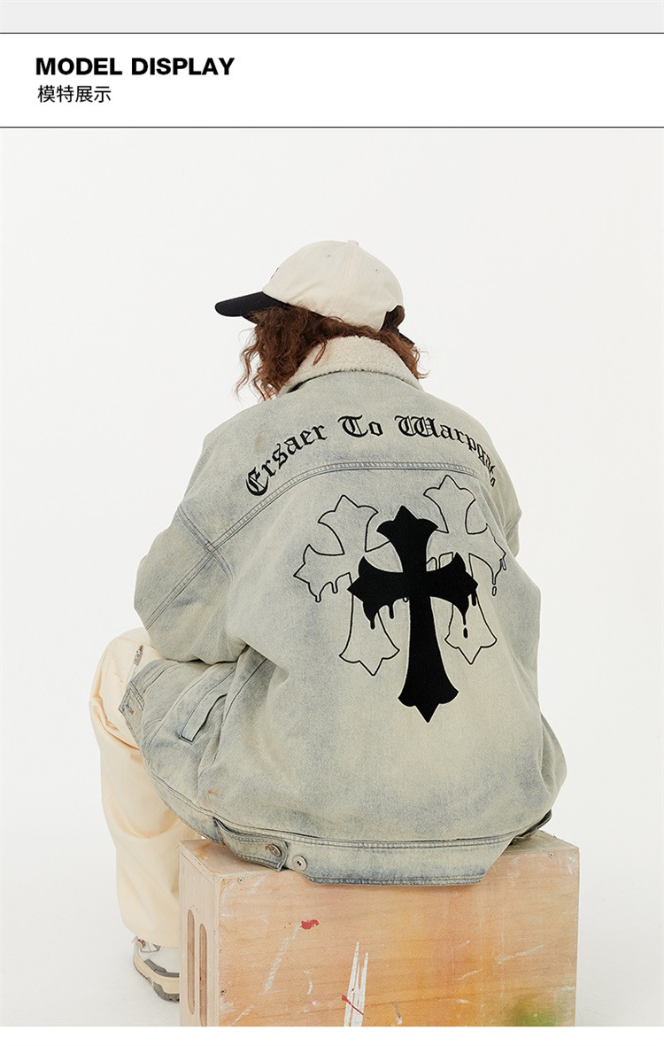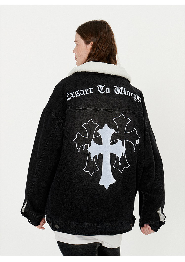 商品名称:十字架仿羊羔绒外套牛仔夹克秋冬款宽松棉衣潮牌保暖拼接男女同款 038359