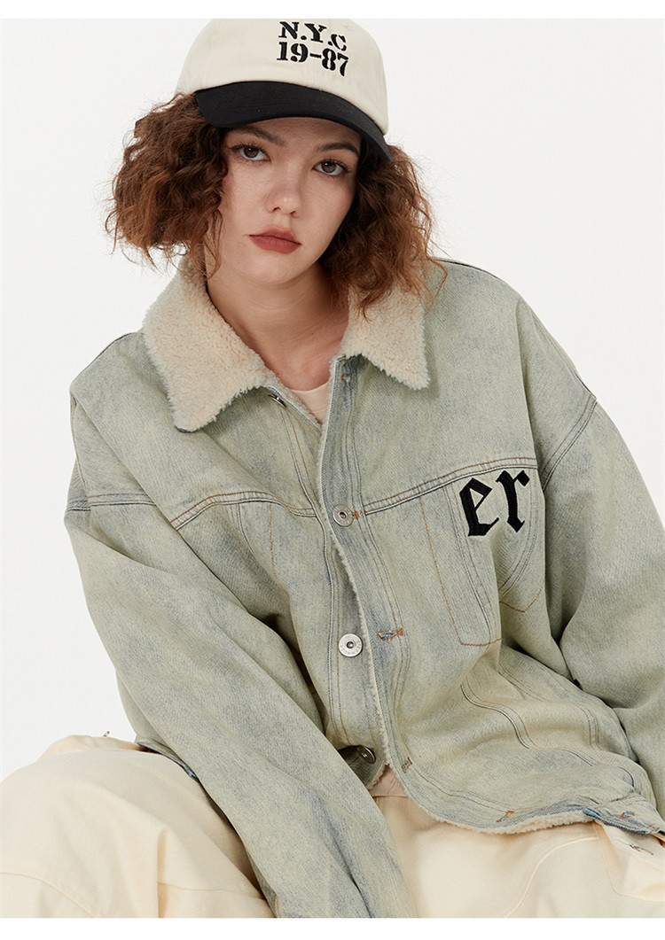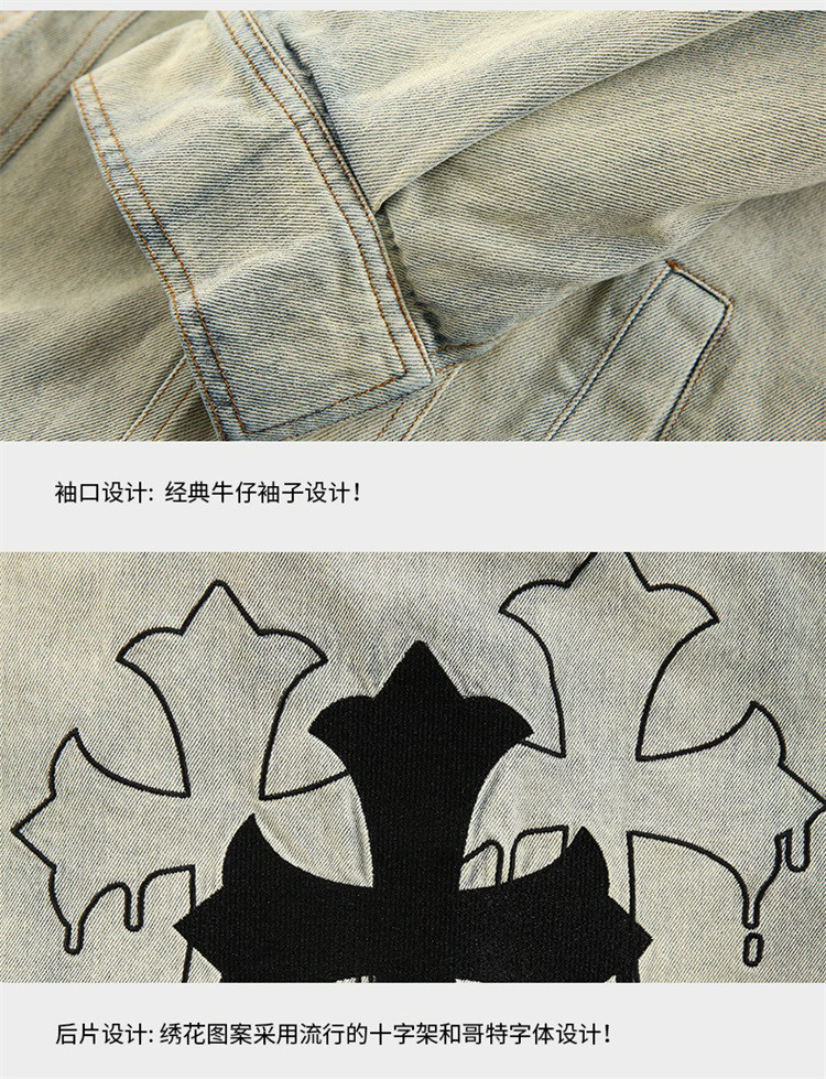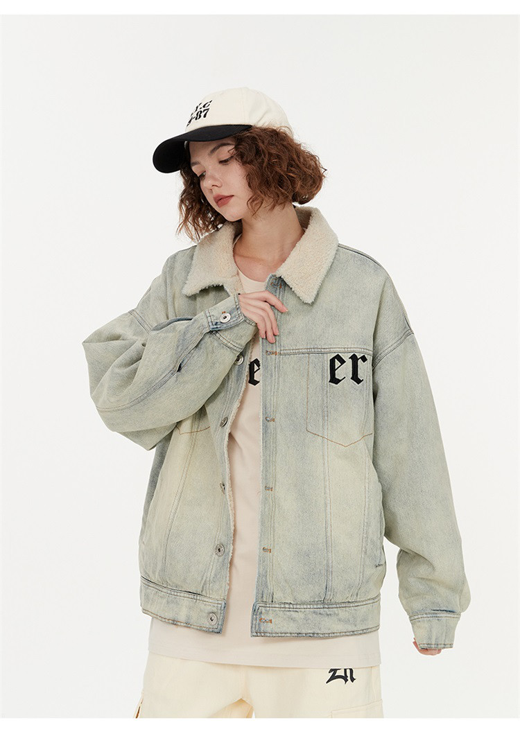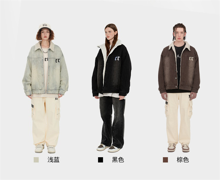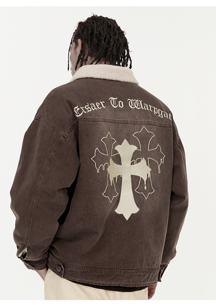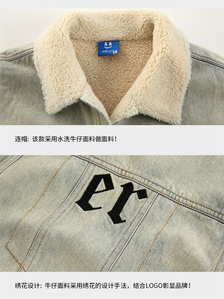 商品名称:十字架仿羊羔绒外套牛仔夹克秋冬款宽松棉衣潮牌保暖拼接男女同款 038359