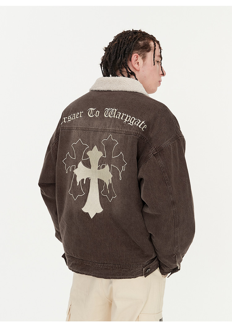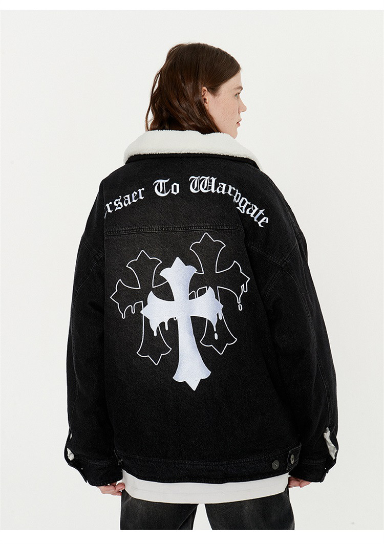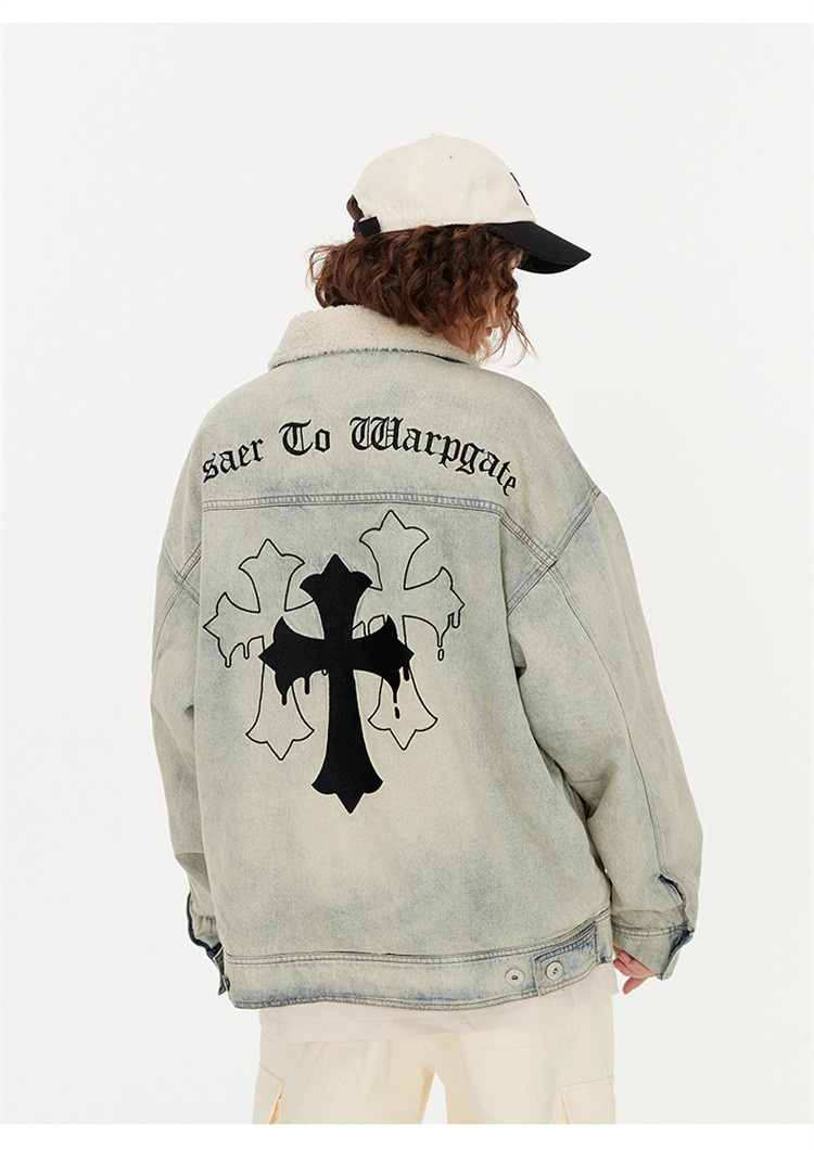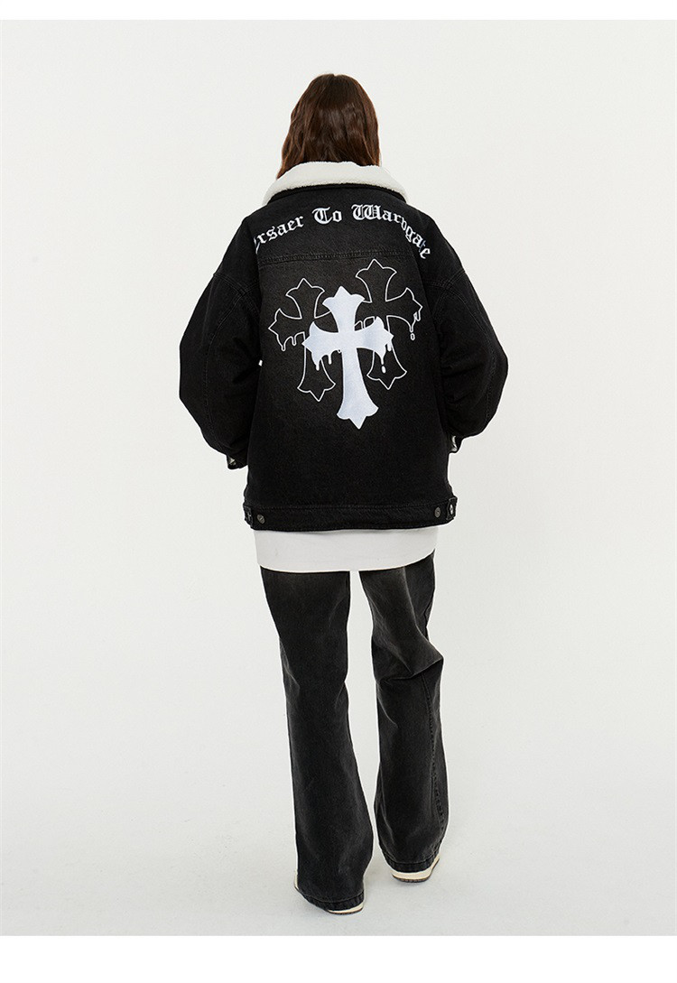 十字架仿羊羔绒外套牛仔夹克秋冬款宽松棉衣潮牌保暖拼接男女同款 038359