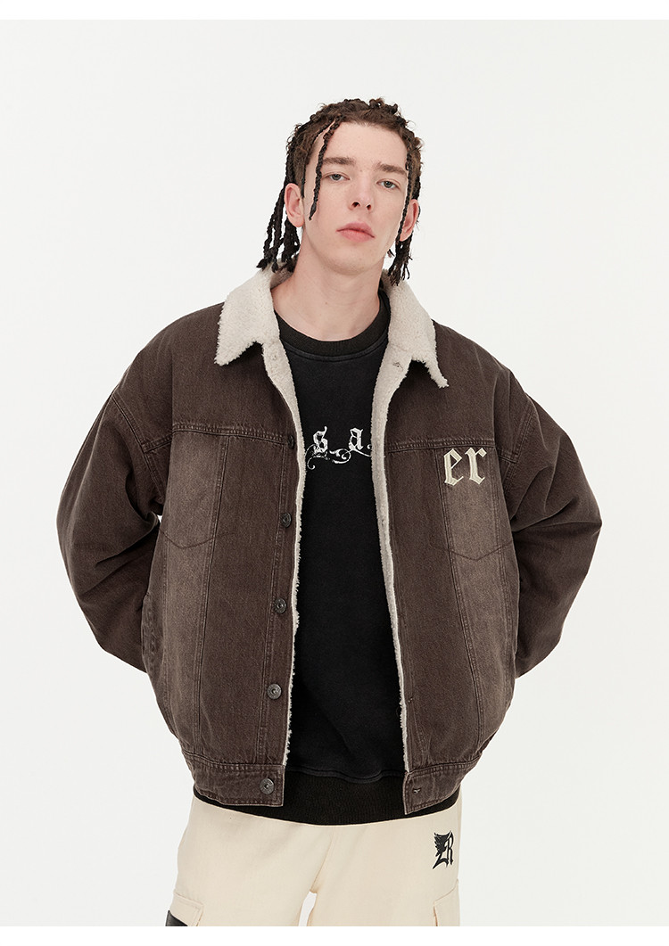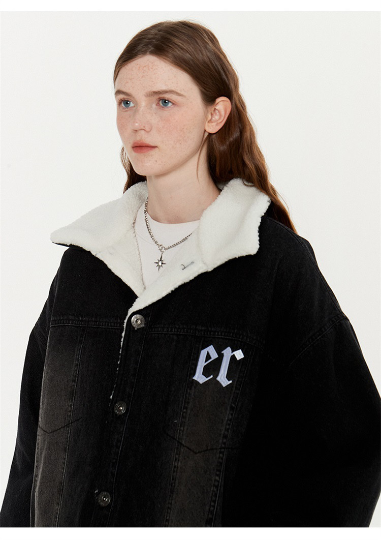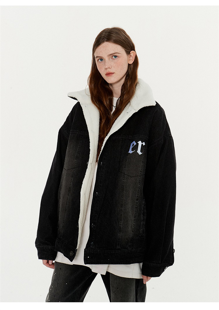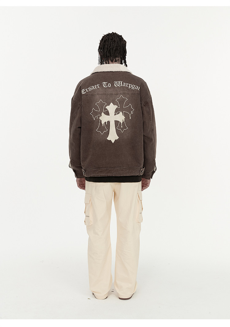 十字架仿羊羔绒外套牛仔夹克秋冬款宽松棉衣潮牌保暖拼接男女同款 038359