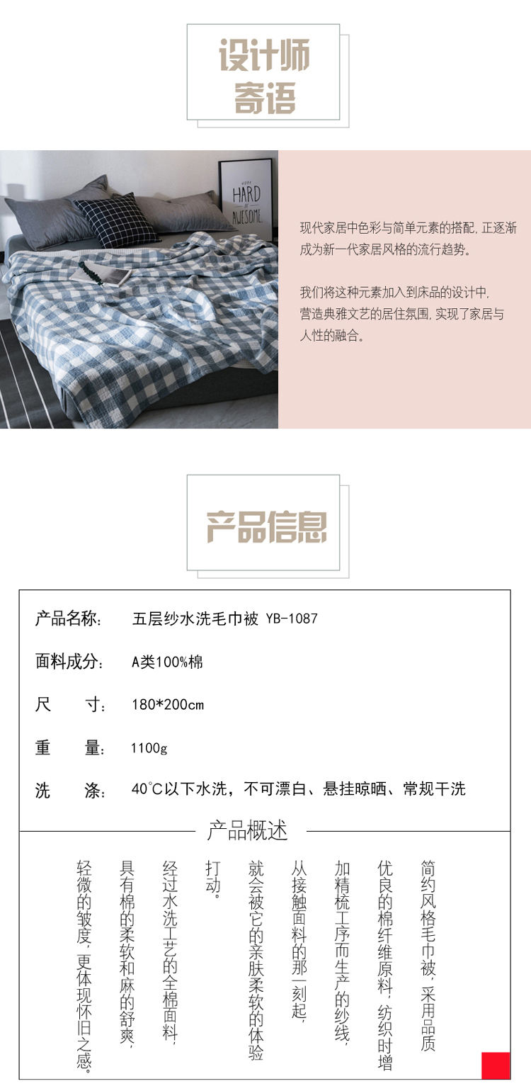 商品名称:悠梦嘉居五层纱水洗毛巾被180*200cm 1100g