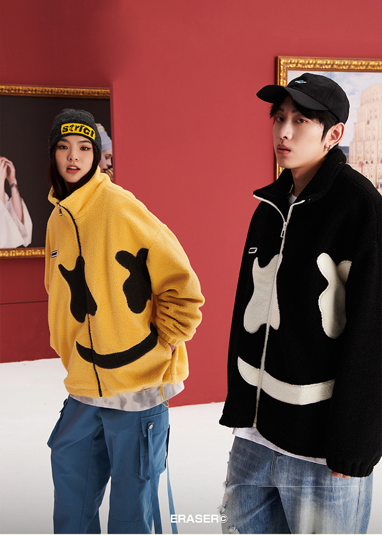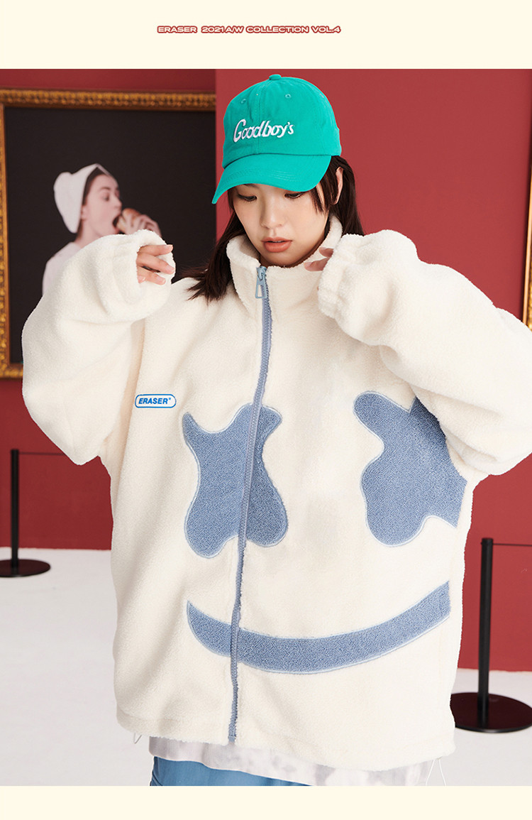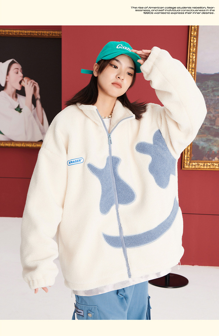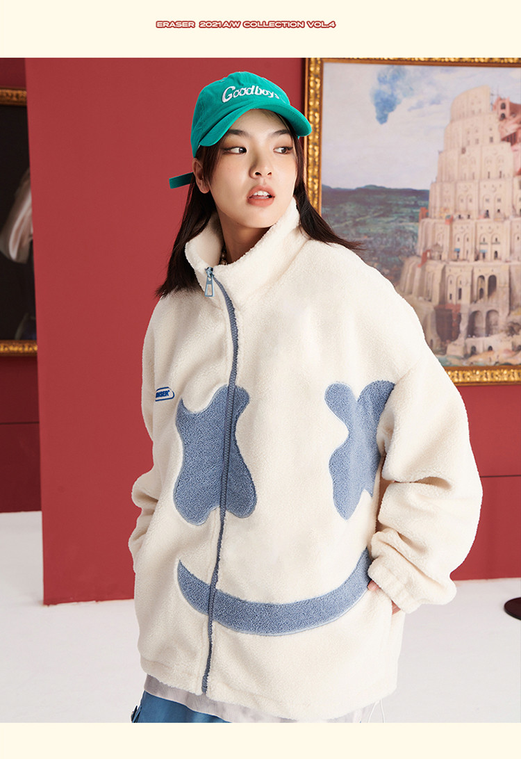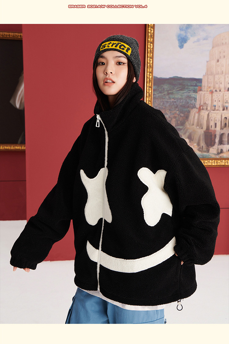 笑脸大LOGO仿羊羔毛外套情侣保暖加厚休闲外套男女同款 035223
