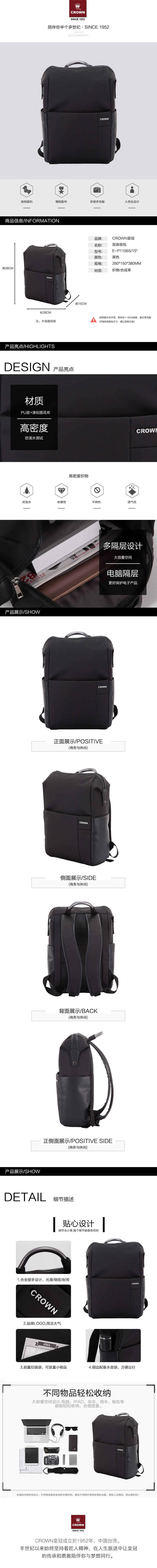 商品名称:CROWN/皇冠双肩背包-黑色E-P1106S/15”