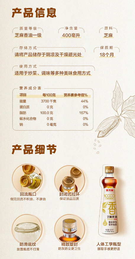 商品名称:金龙鱼10000ppm木脂素芝麻香油400ml*3瓶