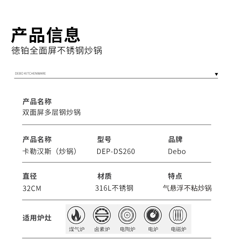 商品名称:Debo/德铂卡勒汉斯双面屏多层钢炒锅套装A款DEP-DS260