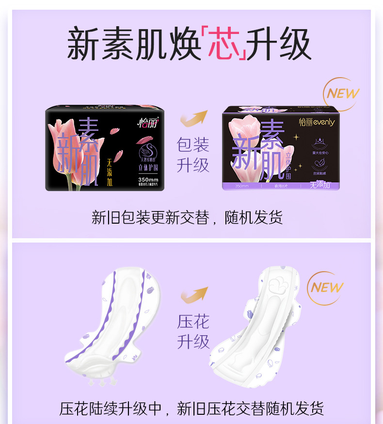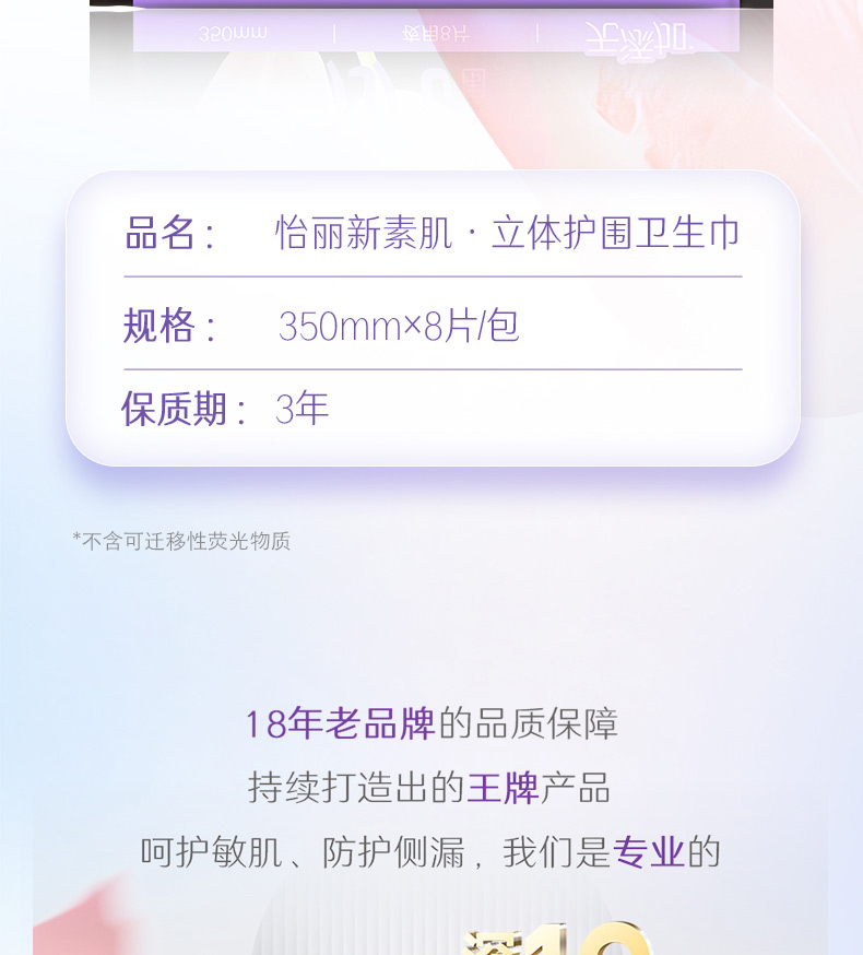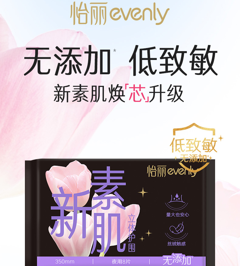 商品名称:ELIS/怡丽新素肌立体护围棉柔纤巧350mm夜用卫生巾8片*8包