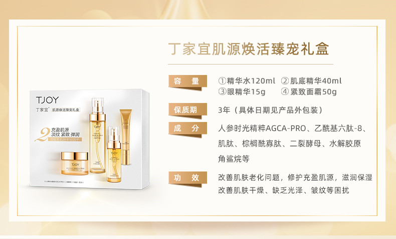 商品名称:【京东/顺丰配送】TJOY/丁家宜肌源焕活臻宠面部护肤礼盒(水120ml+精华40ml+眼精华15g+面霜50g)