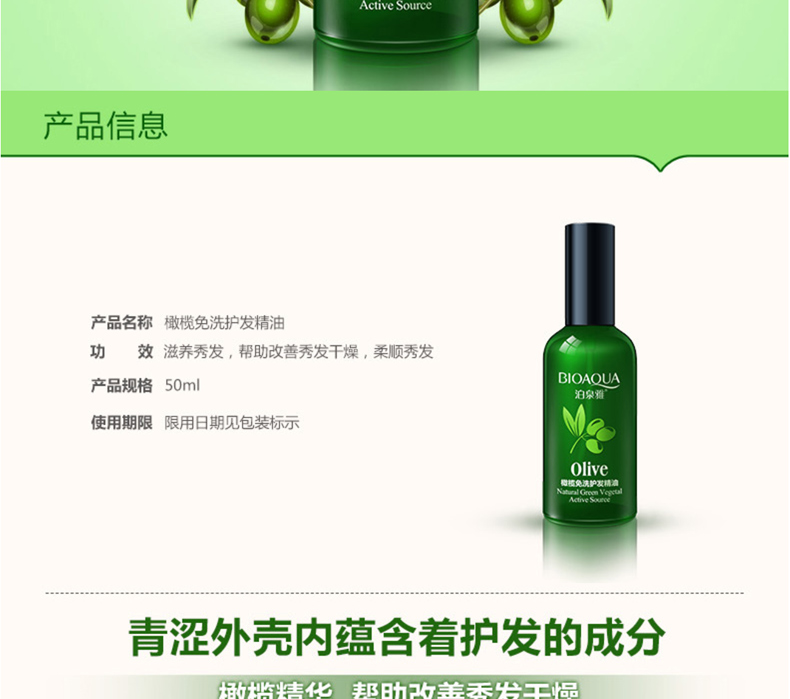 商品名称:泊泉雅橄榄免洗护发精油 滋润保湿柔顺亮泽 50ml