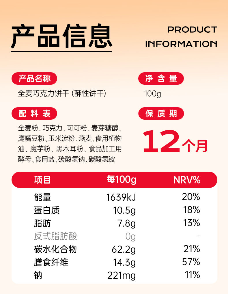 商品名称:QEEWOO/七年五季全麦巧克力饼干100g*4袋