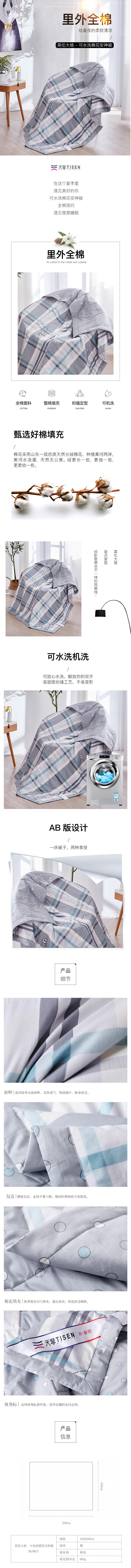 商品名称:TISEN/天琴英伦大格可水洗棉花安神被150*200cm 800g