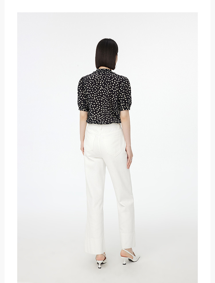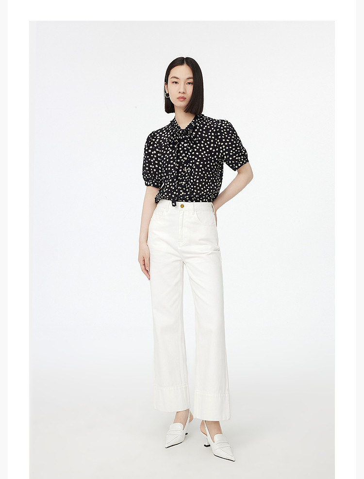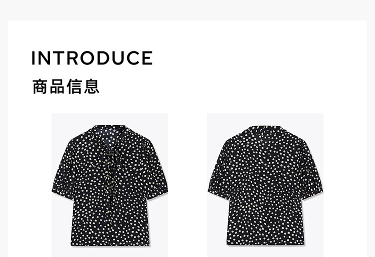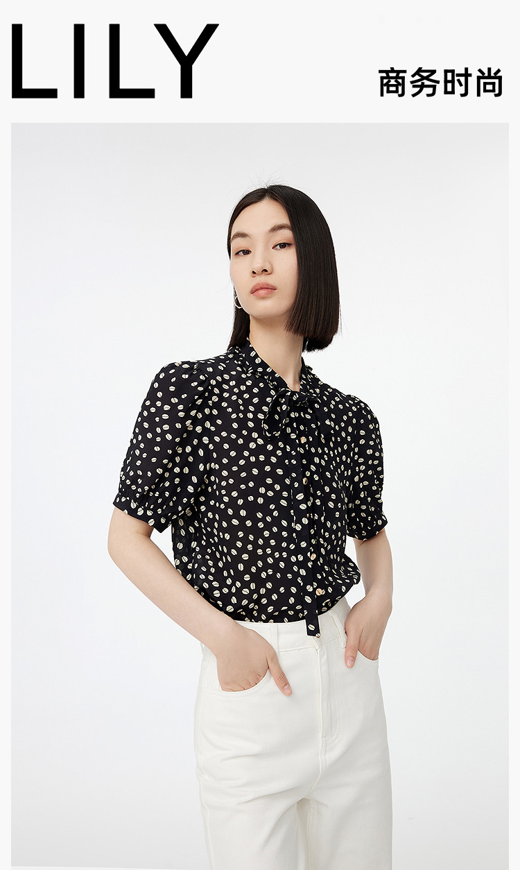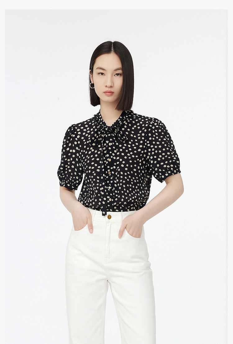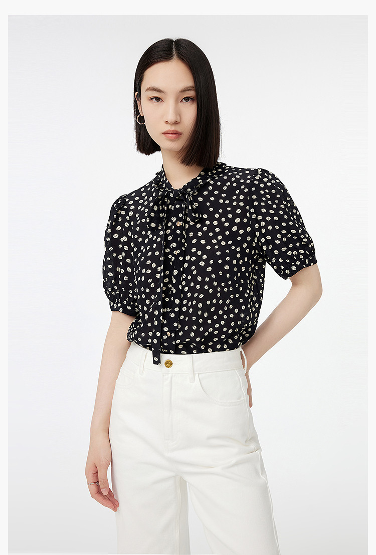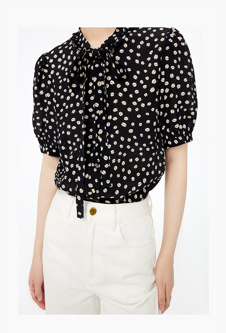 商品名称:春季含真丝趣味印花别致飘带时尚通勤款泡泡袖衬衫 844891