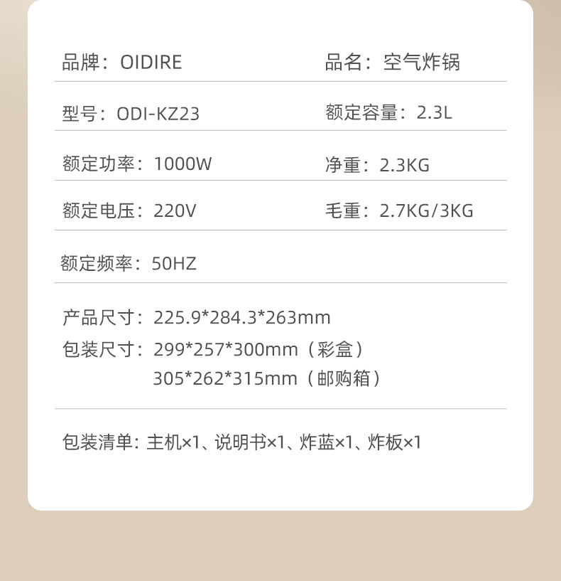 商品名称:OIDIRE 2.3升空气炸锅ODI-KZ23
