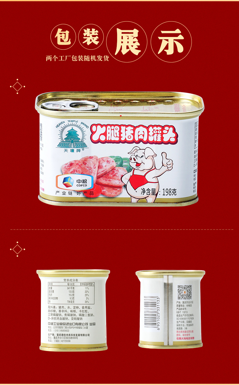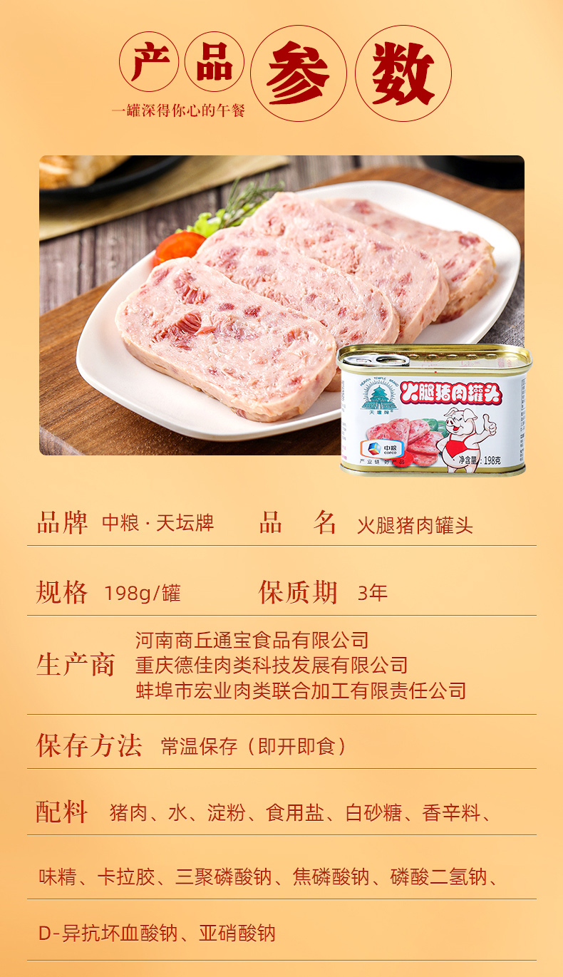 商品名称:天坛牌火腿猪肉罐头198g*3罐