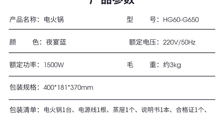 商品名称:Joyoung/九阳6升料理锅-夜宴蓝 HG60-G650