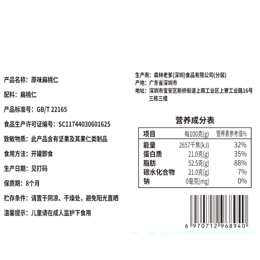 商品名称:森林老爹扁桃仁-原味200g*3罐