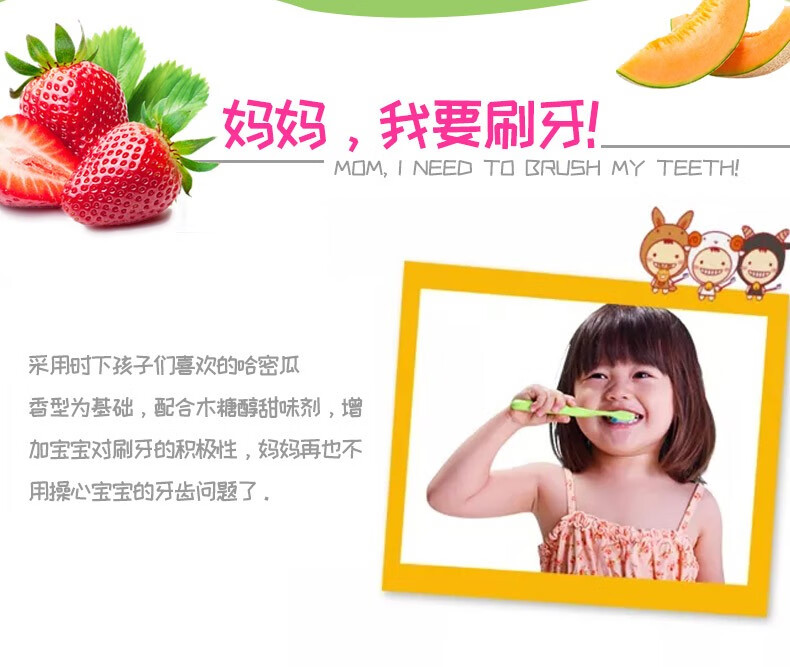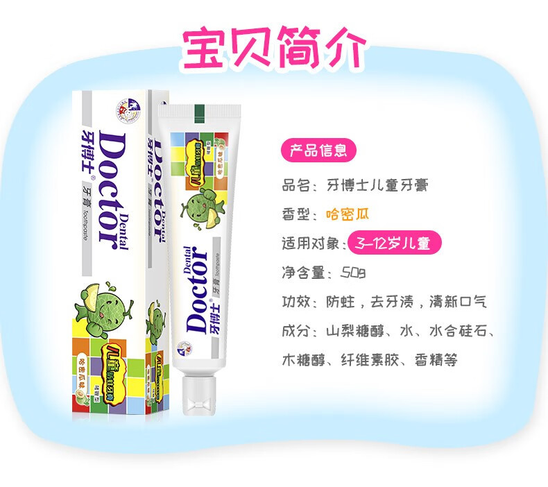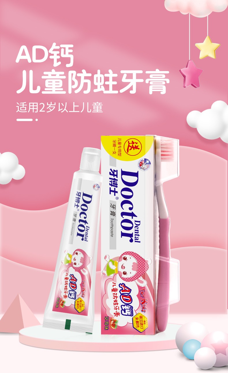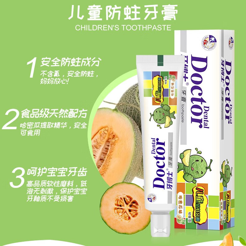 商品名称:Doctor/牙博士儿童防蛀牙膏组合哈蜜瓜味50g*2支+AD钙草莓味50g*2支+牙刷2组