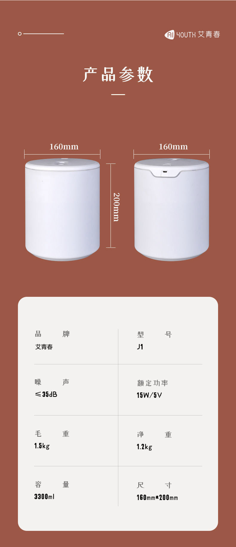 商品名称:AIYOUTH/艾青春3.3升大容量加湿器J1