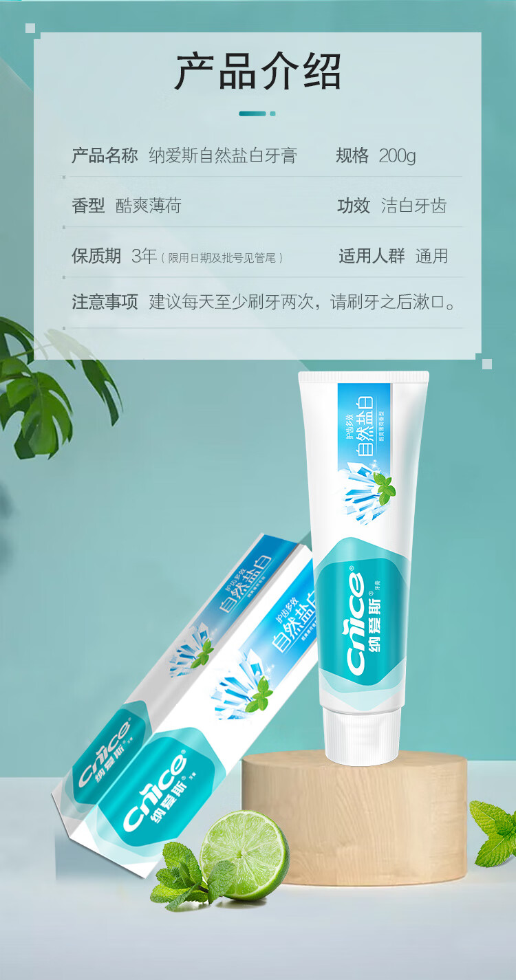 商品名称:纳爱斯自然盐白牙膏-酷爽薄荷香型200g*4支