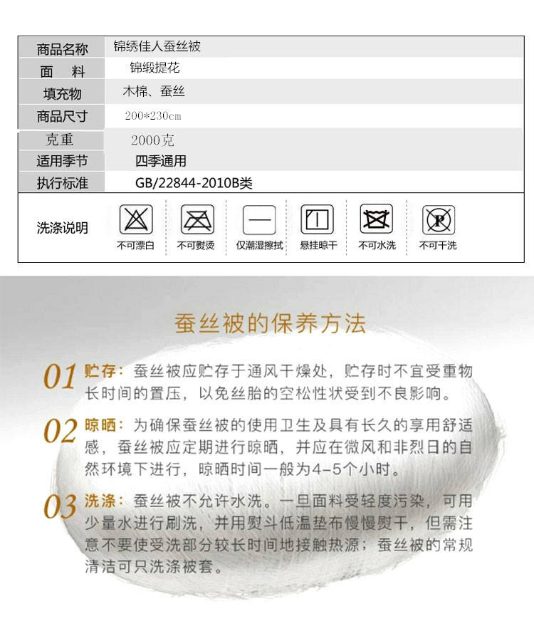 商品名称:圣之澜锦绣佳人蚕丝被200*230cm 2000g