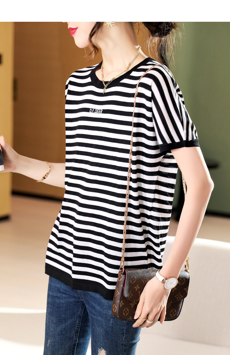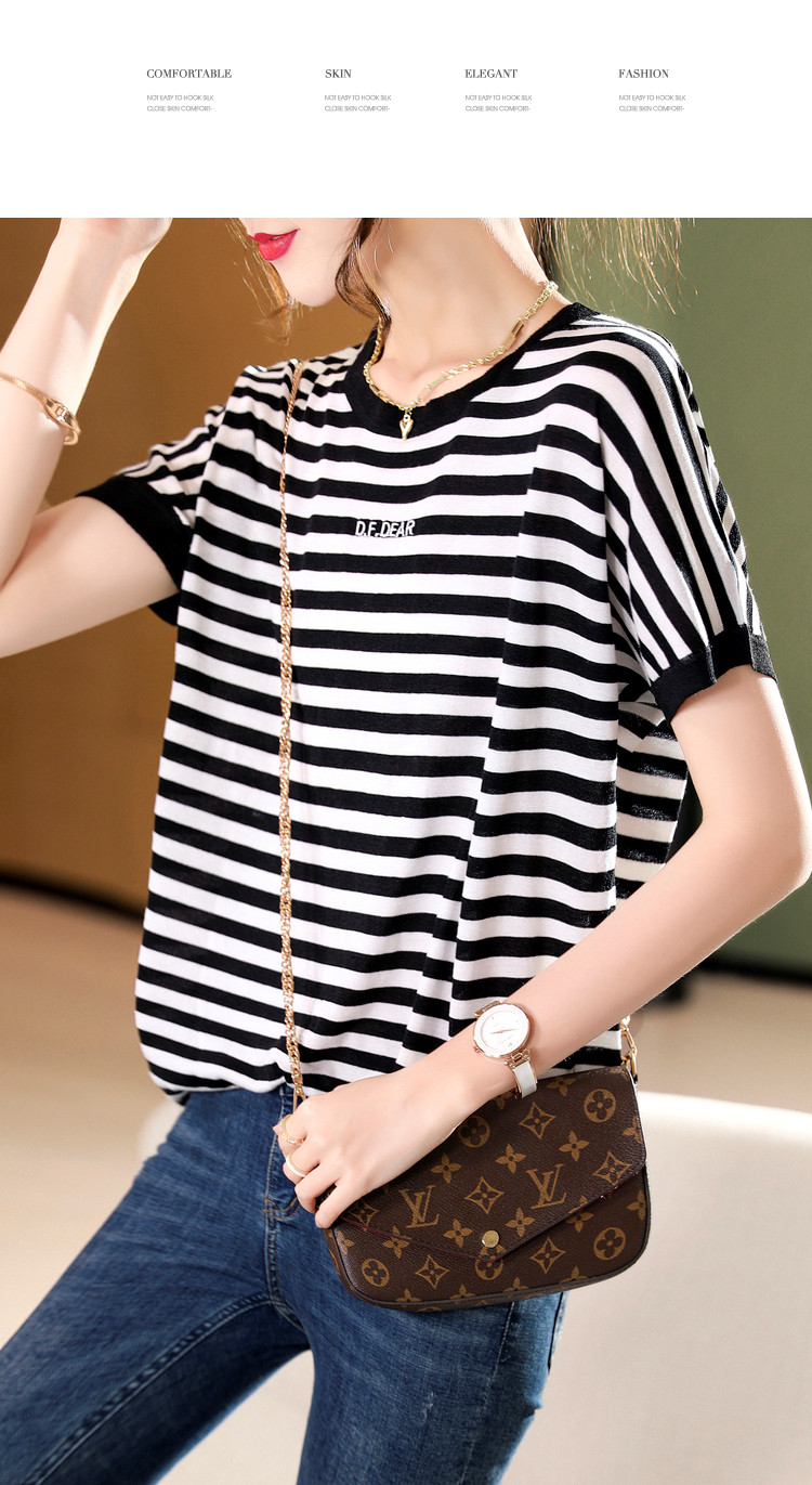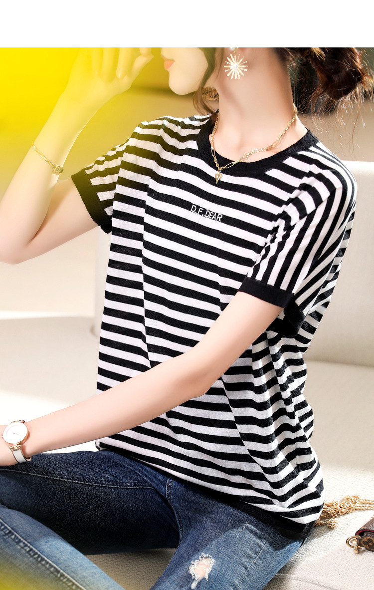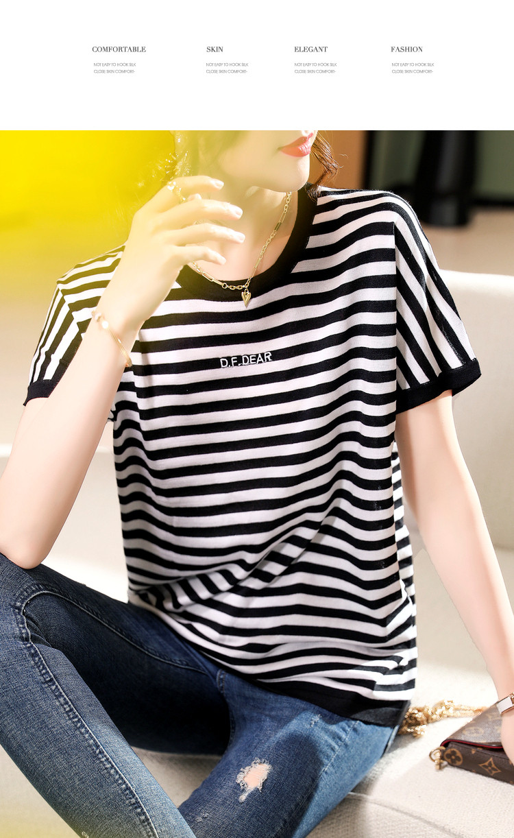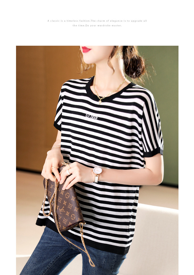 商品名称:【断码捡漏】冰丝T恤高级感经典百搭黑白条纹印字母短袖夏季新款 635529