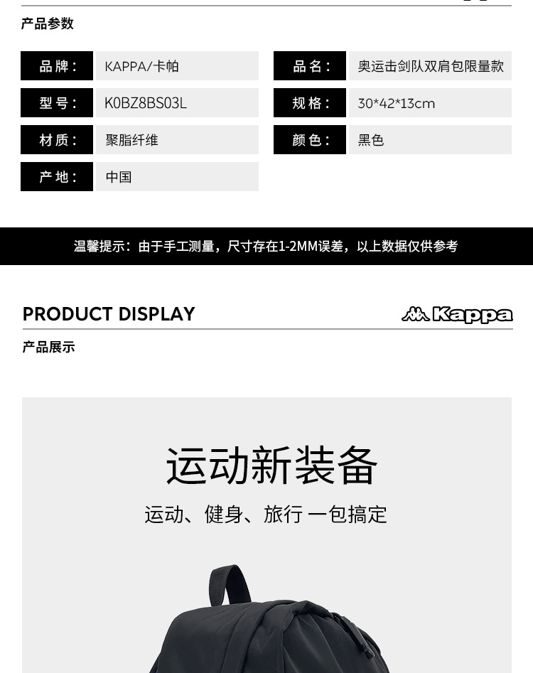 商品名称:KAPPA/卡帕奥运击剑队双肩包限量款-黑色K0BZ8BS03L