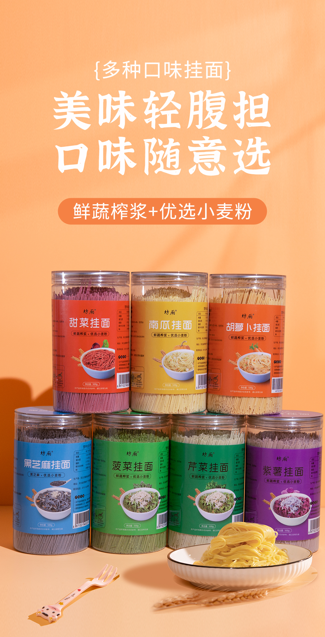 产品规格:甜菜挂面500g+南瓜挂面500g+胡萝卜挂面500g+黑芝麻挂面500g+菠菜挂面500g+芹菜挂面500g+紫薯挂面500g