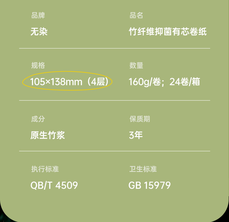 商品名称:无染竹纤维抑菌四层有芯卷纸160g*24卷