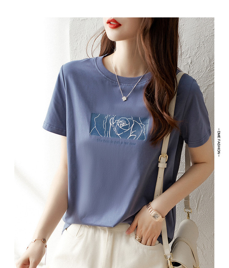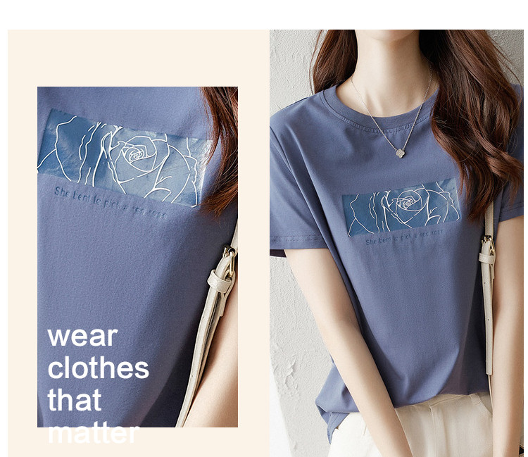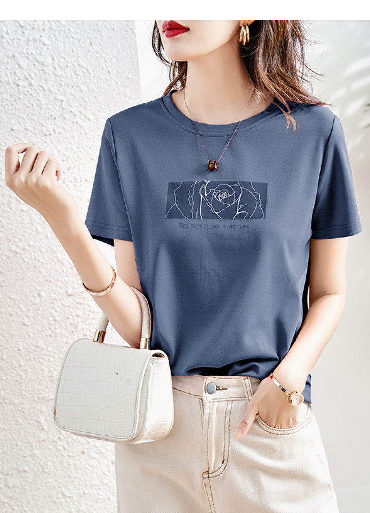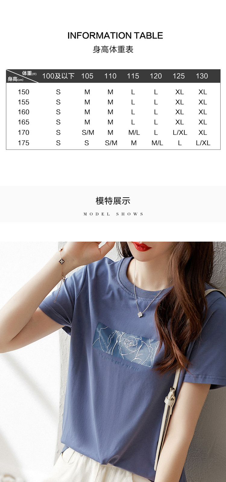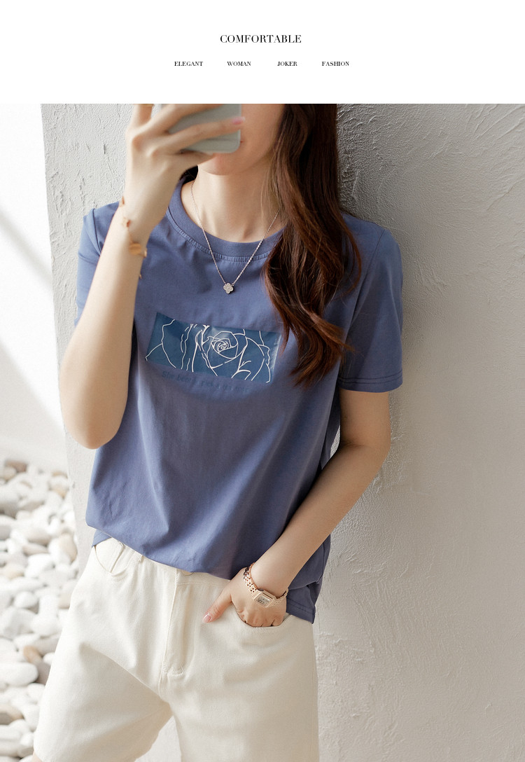 【玫瑰印花】夏季圆领短袖宽松t恤女棉氨针织女式t恤 918401