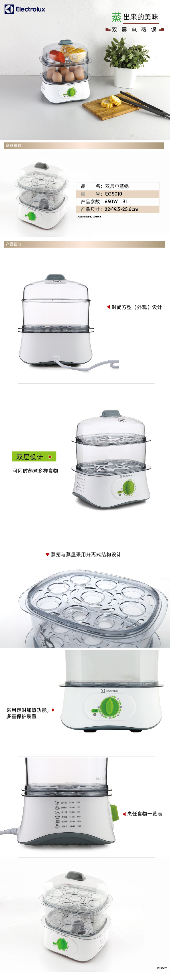 商品名称:【德邦配送】Electrolux/伊莱克斯3升True-love双层电蒸锅EGS010