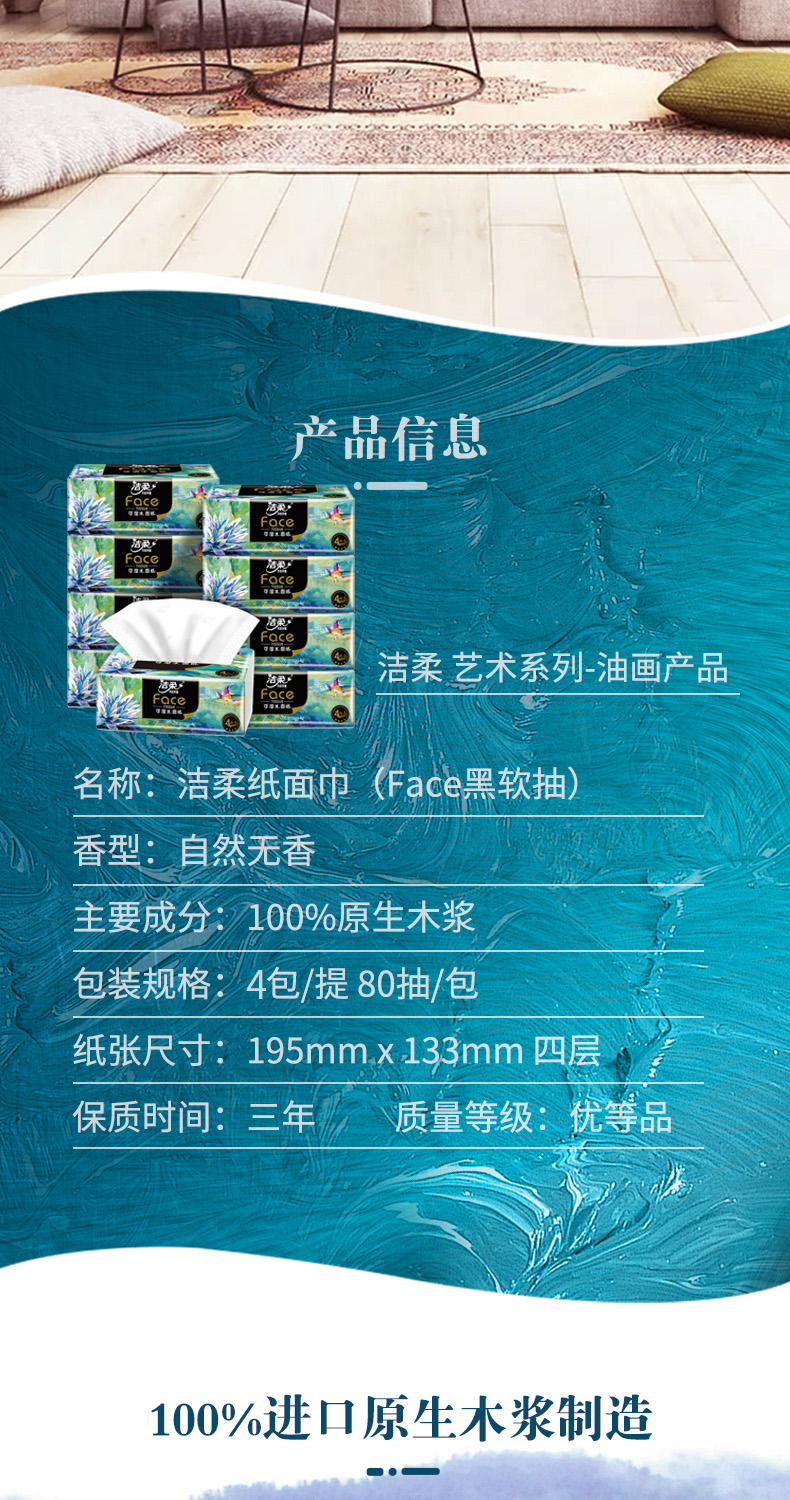 商品名称:C&S/洁柔Face自然无香四层艺术油画系列可湿水黑软抽纸80抽*4包*8提