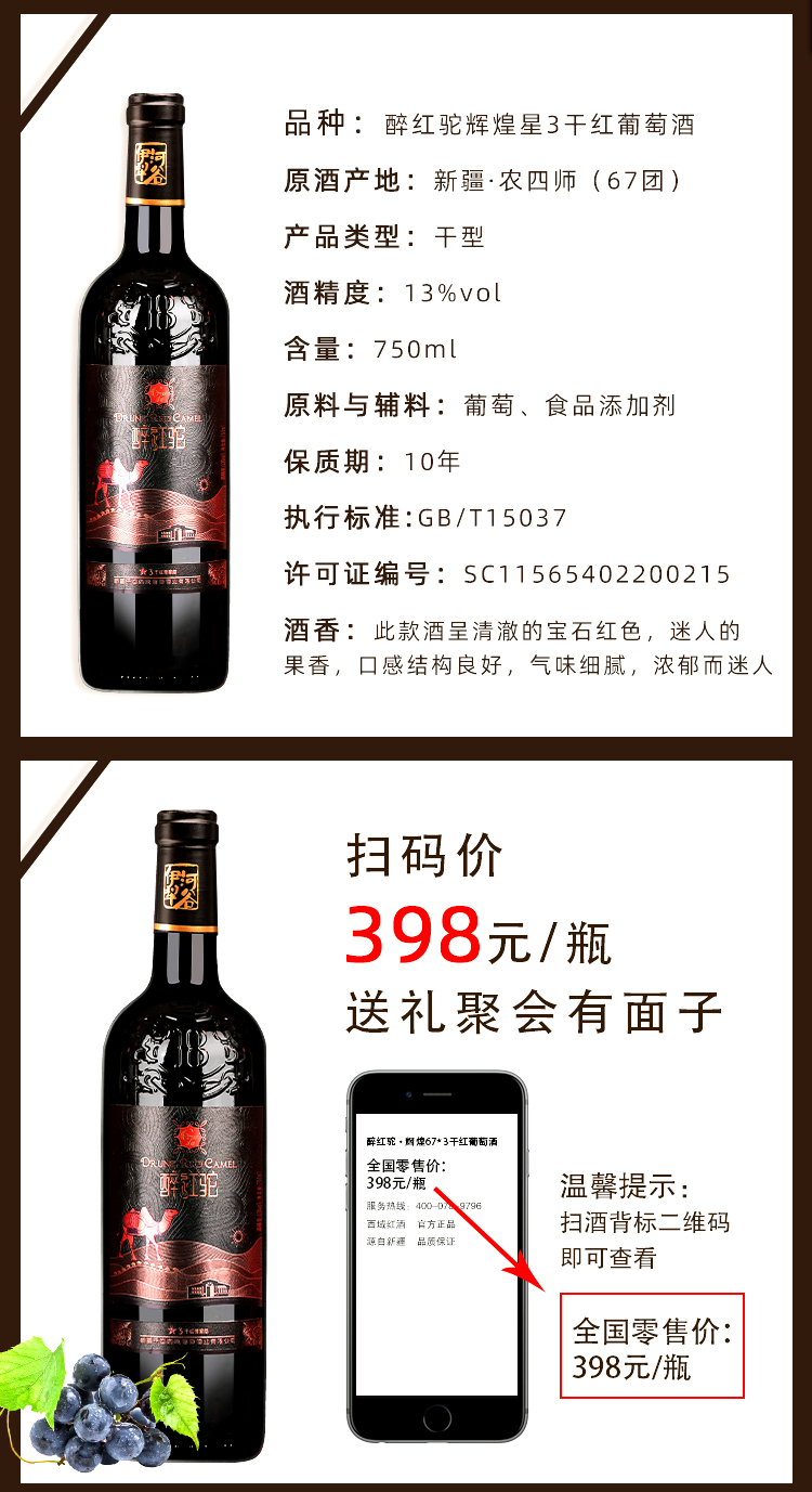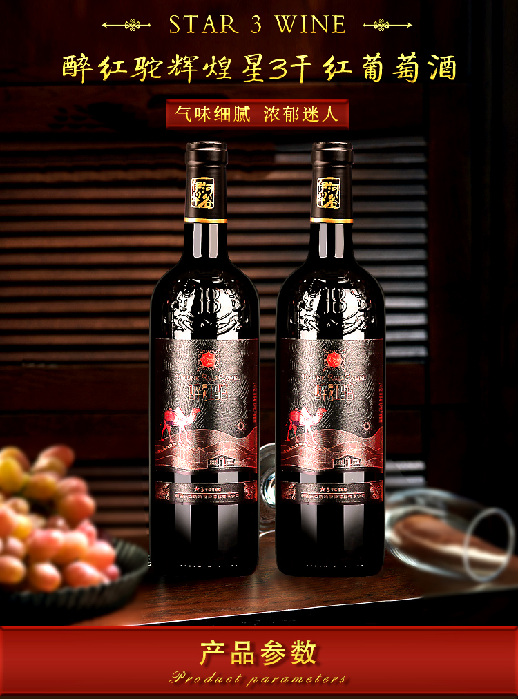 商品名称:醉红驼星3新疆干红葡萄酒送开瓶器红酒整箱醒酒器包装礼盒