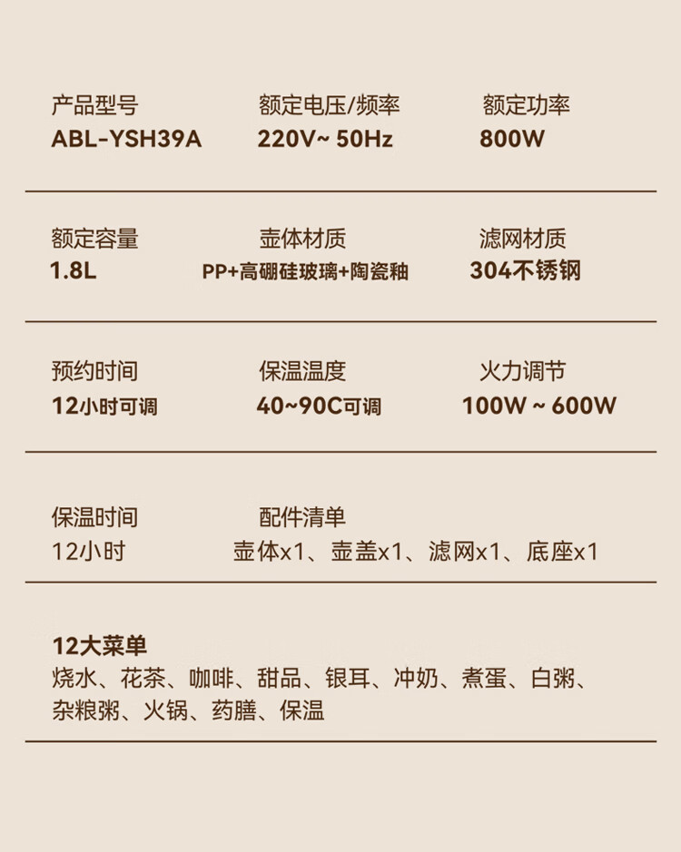 商品名称:ABEREVE/艾贝丽1.8升多功能养生壶ABL-YSH39A